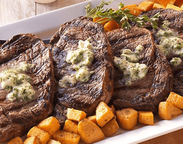 Снимаем стейки с гриля, кладём сверху ложку масла с хреном и даем ему постоять 3-5 минут. Подаем теплым с картофелем.