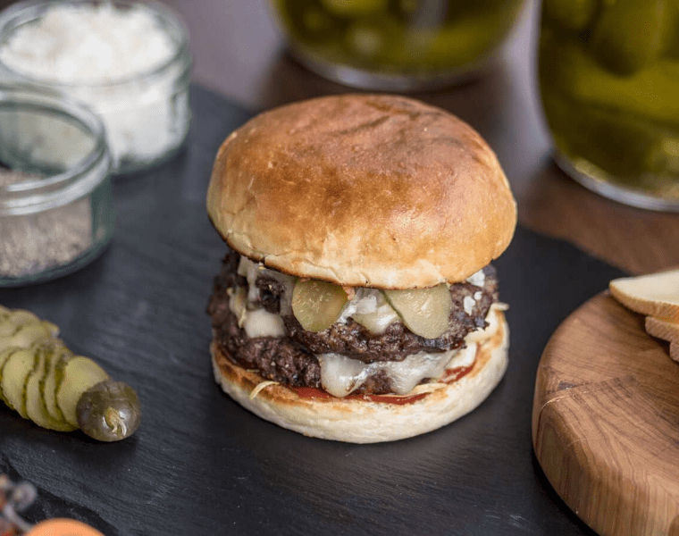 Пока котлеты «отдыхают», выкладываем булочки разрезом вниз в зону прямого средне-сильного жара и слегка обжариваем их 15-30 секунд, не накрывая крышкой. Шинкуем листья салата, нарезаем корнишоны тонкими пластинками, кладем лук в подходящую посуду и добавляем маринад от корнишонов (позднее маринад следует слить). Собираем бургеры: смазываем булочку кетчупом, кладем салат, две котлетки, лук, корнишоны, смазываем кетчупом верхнюю булочку и накрываем бургер. Затем сразу подаем бургеры к столу.