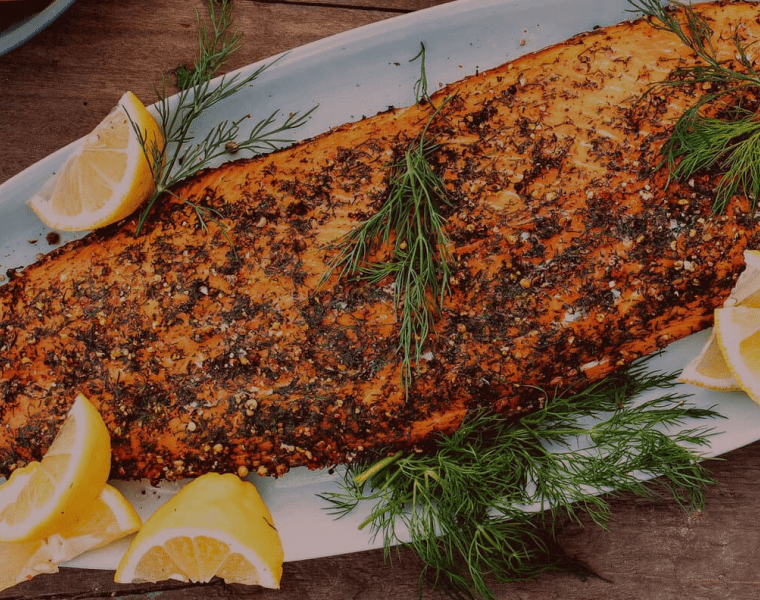 Вынимаем кедровую доску из воды и помещаем её в гриль на непрямой жар. Разворачиваем филе лосося и кладем его на доску, кожей вниз. Готовим лосося на непрямом слабом жаре под крышкой примерно 1 час, пока термометр, вставленный в самую толстую часть филе, не покажет 57 °С.