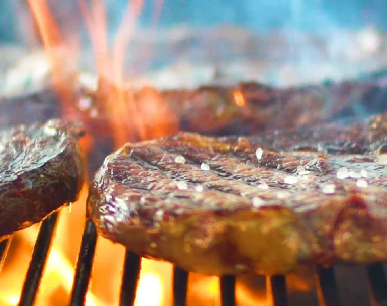 Выкладываем стейки на гриль в зону прямого жара и солим их крупной морской солью. Готовим 2,5 минуты под закрытой крышкой, за это время соль растает и впитается в мясо. После этого переворачиваем стейки, солим с другой стороны и готовим под крышкой еще 2,5 минуты.
