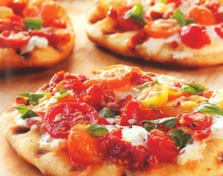 Выкладываем на каждую чиабатту немного помидоров, кладем сверху ломтик моцареллы, или посыпаем натертым сыром. Аккуратно выкладываем заготовки на разогретый камень для пиццы и готовим ещё 2-3 минуты на прямом среднем жаре, пока сыр не расплавится.