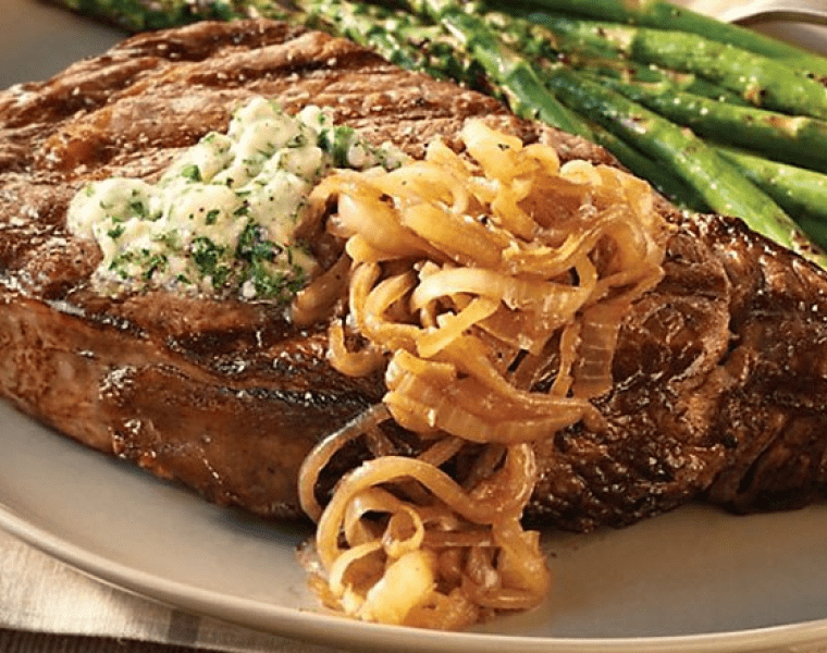 Подаём стейки тёплыми, положив сверху на каждый по ложке масла с синим сыром и украсив блюдо пассерованным луком.