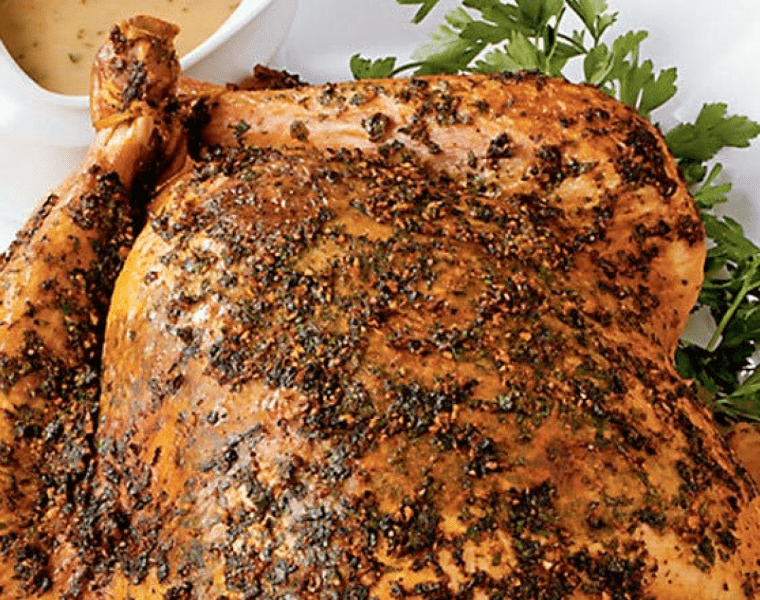 Если на ногах индейки есть стальная или пластиковая стяжка, оставляем её на тушке. Начиная с шеи аккуратно отделяем кожу (не снимая) от её грудки пальцами. Берем примерно половину приготовленной масляной смеси и равномерно натираем ей грудку под кожей.