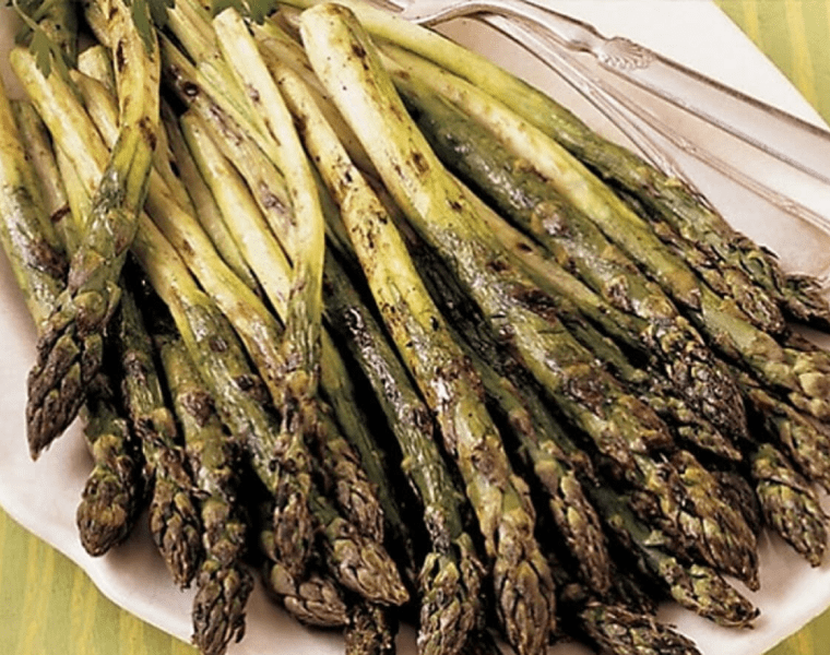 Очищаем решетку, укладываем спаржу (поперек решетки) и готовим на прямом среднем жаре под крышкой, чтобы она подрумянилась, но не обуглилась (6-8 минут), периодически переворачивая. Подаем к столу теплой или остывшей до комнатной температуры.