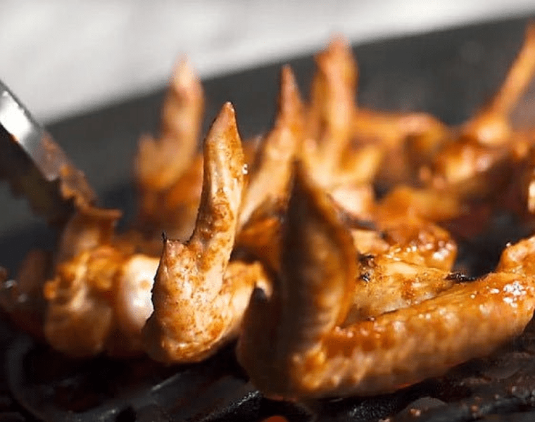 Выкладываем крылья на решетку Sear Grate прямо над углями и обжариваем по 20-30 секунд с каждой стороны, не закрывая крышку гриля.