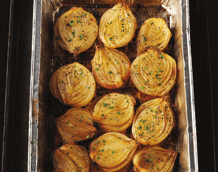 Перемещаем поддон в зону непрямого жара и готовим лук под крышкой 10-15 минут, чтобы он стал еще нежнее и начал темнеть, за это время аккуратно переворачиваем 1-2 раза. Если требуется, чтобы лук еще некоторое время оставался теплым (по желанию), можно накрыть поддон фольгой и держать в гриле еще до 30 минут. Надеваем перчатки для гриля и снимаем поддон с решетки. Сбрызгиваем лук винным уксусом, посыпаем свежей петрушкой и подаем к столу теплым.