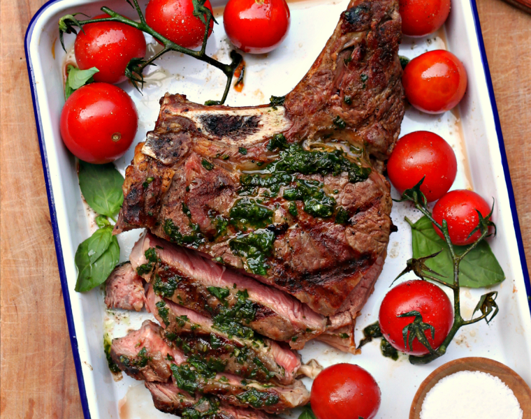 Подаем стейки к столу теплыми, с помидорами на ветке и соусом с базиликом.