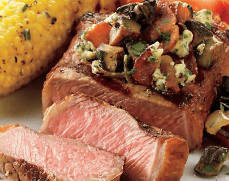Поднимаем температуру гриля до сильного жара (230-290 °С). Готовим стейки на прямом сильном жаре под крышкой, пока они не достигнут желаемой степени готовности (6-8 минут для слабой прожарки medium rare) переворачивая 1-2 раза. Снимаем блюдо с гриля и даем постоять 3-5 минут, и подаем к столу теплым с гарниром.