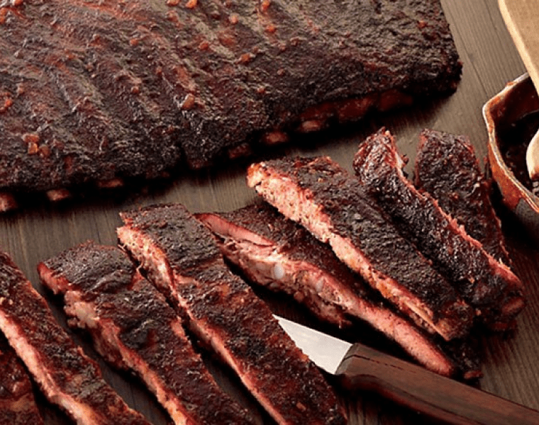 Готовим блюдо, пока мясо не отойдёт от кости в нескольких местах примерно на сантиметр и не будет легко отделяться, если потянуть за рёбрышки (от 3 до 4 часов). Поддерживаем температуру около 120-150°С. При использовании угольного гриля, по мере необходимости пополняем запас угля в гриле, оставляя новые брикеты примерно по 5 минут без крышки, чтобы дать углю разгореться. Также добавляем щепу приблизительно раз в 45 минут для крупной щепы, или раз в 20 минут для стружки и мелкой щепы.