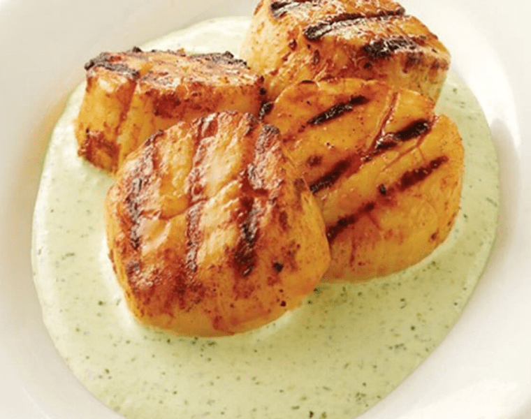Снимаем гребешки с гриля и сразу же подаем к столу, полив зеленым соусом чили.