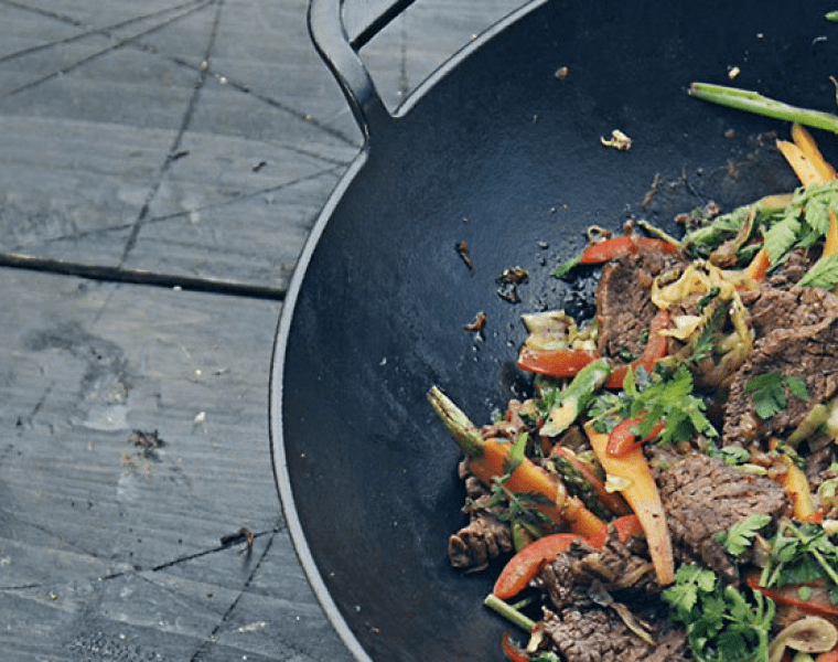 Кладём в вок овощи, немного их пассеруем, затем добавляем к ним обжаренное мясо, все перемешиваем и посыпаем зеленью. Приправляем блюдо соевым соусом и посыпаем солевыми хлопьями. Подаем блюдо к столу. Совет от шеф-поваров Weber: Используйте любые сезонные овощи на своё усмотрение.