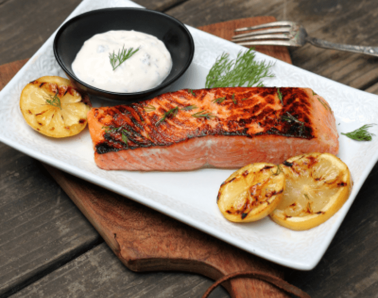 Аккуратно вставляем лопатку между филе лосося и кожей и снимаем филе на тарелки, туда же выкладываем поджаренные ломтики лимона. Украшаем блюдо укропом и подаем его к столу вместе с йогуртовым соусом.