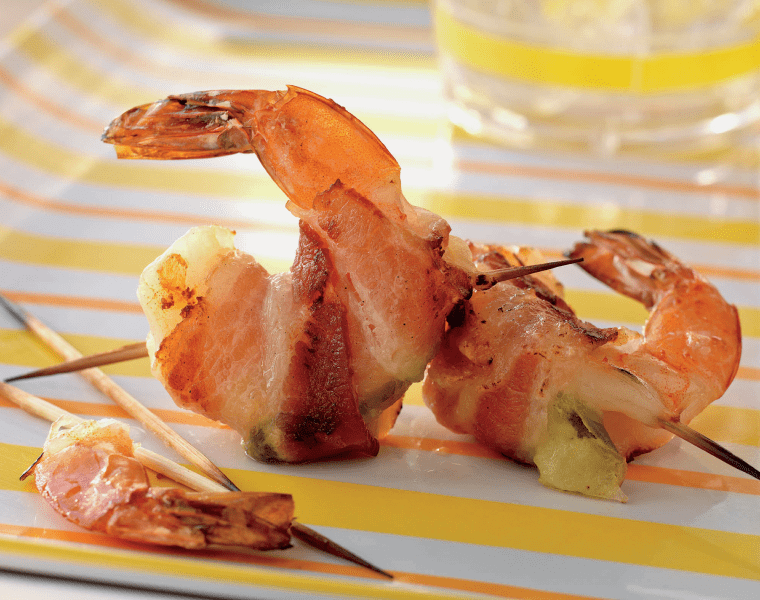 Кладем в каждую креветку один кусочек сыра и кольцо халапеньо. Закрываем креветку и оборачиваем ее ломтиком бекона, чтобы сыр и халапеньо были спрятаны. Вставляем зубочистку в креветку через незафиксированный край полоски бекона, чтобы креветка оставалась закрытой и бекон был прижат. Готовим попперс на прямом среднем жаре под крышкой 6-8 минут, за это время переворачиваем 1 раз (креветки должны стать более плотными и непрозрачными в середине, а бекон — хрустящим). Снимаем креветки с гриля и подаем к столу горячими.