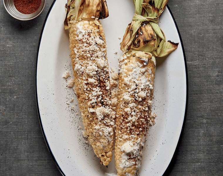 Отгибаем листья початков и фиксируем. Выкладываем кукурузу на гриль и готовим на прямом среднем жаре под крышкой 10-15 минут, периодически переворачивая. После этого снимаем с гриля.