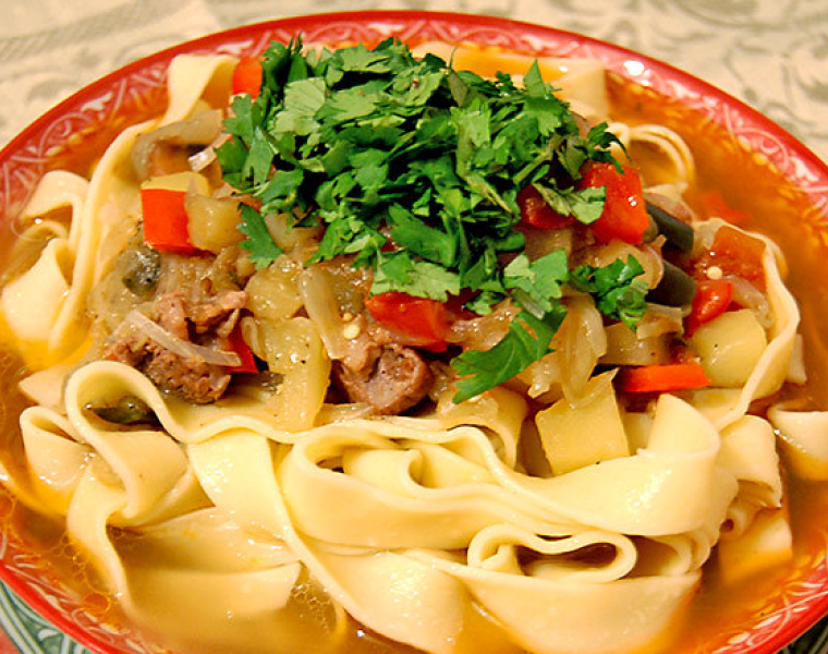 Пока лагман томится, отвариваем лапшу для лагмана в подсоленной воде, нарезаем зелень. В глубокую тарелку выкладываем лапшу (примерно половину объема тарелки), сверху заливаем лагманом и посыпаем нарезанной зеленью.
