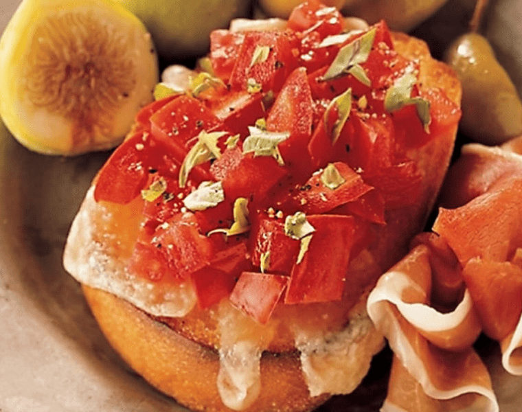 В маленькой миске смешиваем томаты с маслом и уксусом и посыпаем солью и перцем. Выкладываем немного помидоров на каждый тост, и украшаем базиликом, затем подаем к столу теплыми.