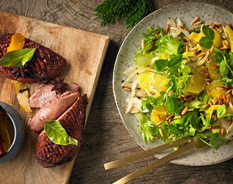 Моем салат, обсушиваем его, рвем на части и выкладываем на блюдо, смешивая его с поджаренным на гриле фенхелем и дольками апельсина, затем посыпаем поджаренными кедровыми орешками и подаём к столу с утиной грудкой, копченной на еловых ветках.