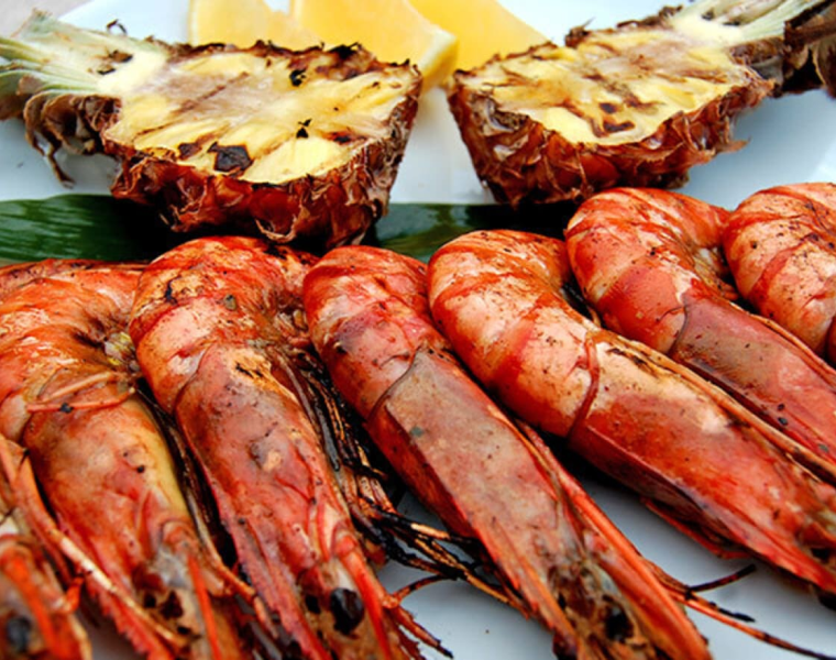 Готовим гриль для прямого среднего жара (170-230 °С). Выкладываем ананас срезом вниз и креветок на решетку, готовим креветок 4-6 минут, регулярно переворачивая и смазывая кисточкой оставшимся маринадом.