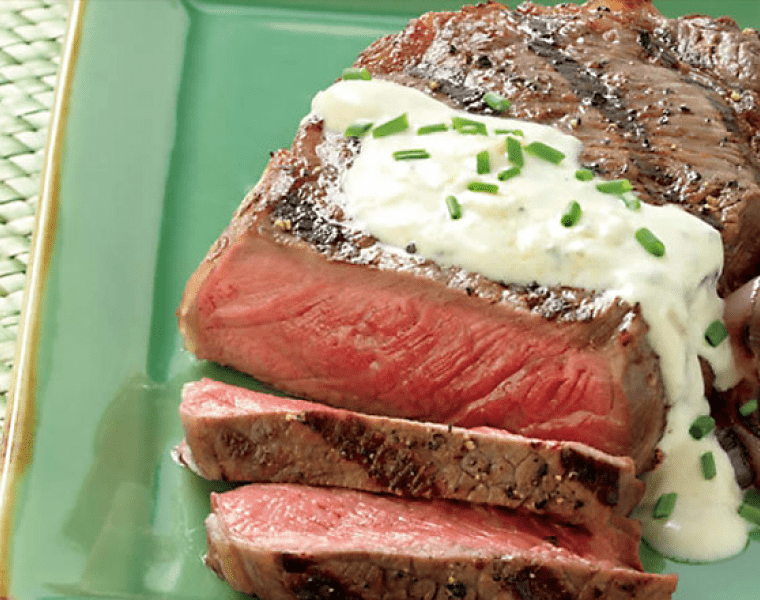 Очищаем решётку. Готовим стейки на прямом сильном жаре под крышкой до желаемой степени готовности (6-8 минут для слабой прожарки medium rare), переворачивая 1-2 раза. Снимаем стейки с гриля и даем постоять 3-5 минут, затем подаем теплыми с соусом, украшая его зеленым луком.