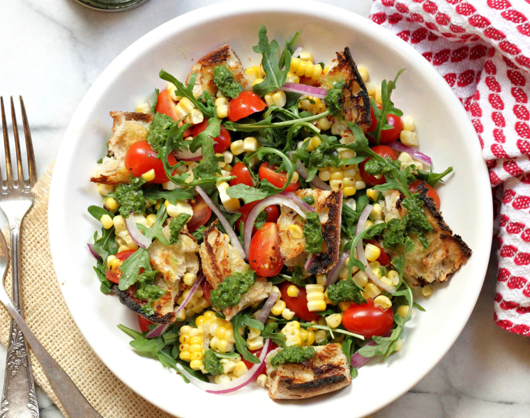 Выкладываем рукколу в посуду для сервировки. Добавляем сверху помидоры, кукурузу и лук, накрываем кусочками багета. Аккуратно перемешиваем. Поливаем заправкой и подаем блюдо к столу теплым.