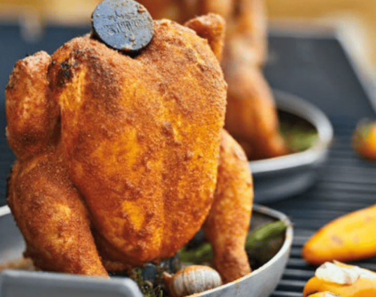 Затем слегка смыть соль, натереть курицу маринадом с внутренней и внешней стороны. В углубление подставки для курицы налить пиво и насадить курицу на подставку. Вручную продавить чеснок и положить вместе с розмарином в центр.
