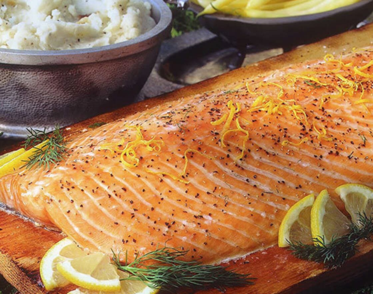 Снимаем кедровую доску с гриля на жаропрочную поверхность, затем подаем лосося к столу теплым, или остывшим до комнатной температуры.