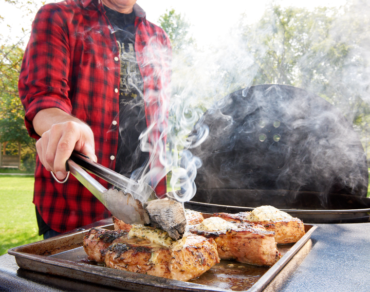 Вынимаем свиные отбивные из холодильника и емкости, даем остаткам маринада стечь и выбрасываем маринад. Готовим отбивные на прямом среднем или сильном жаре под крышкой 6-8 минут, пока они не станут розоватыми в середине, переворачиваем один раз.