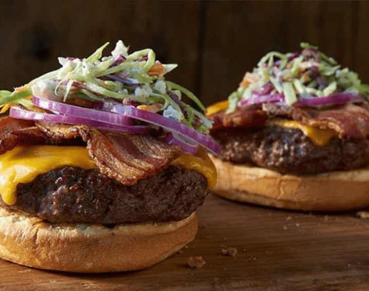 Чтобы собрать бургеры, на основание каждой булочки укладываем котлету, ломтик бекона, разорванные пополам, луковое кольцо и коул-слоу. Накрываем сверху второй частью булочки и подаем к столу теплыми.
